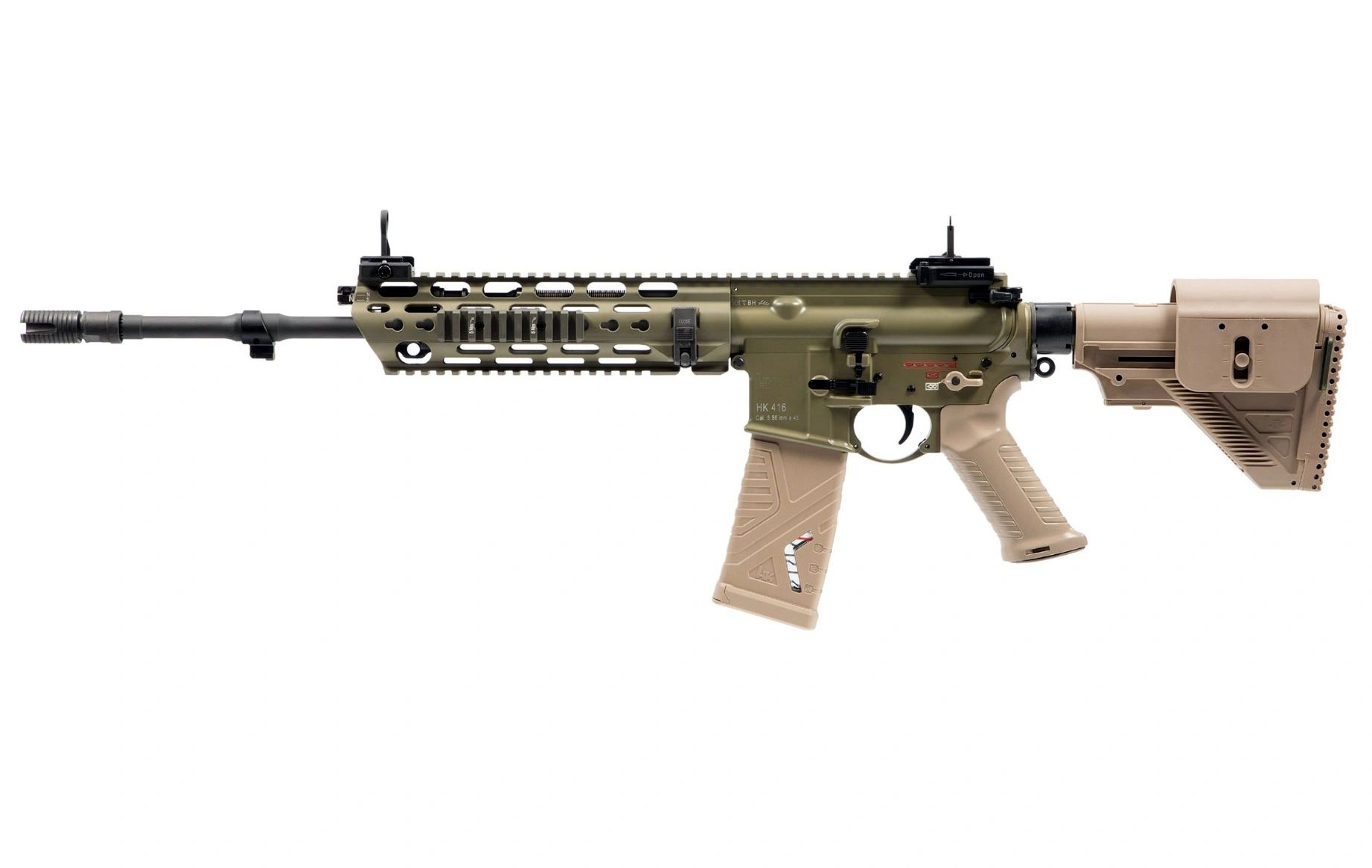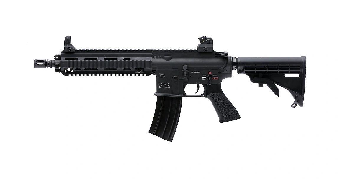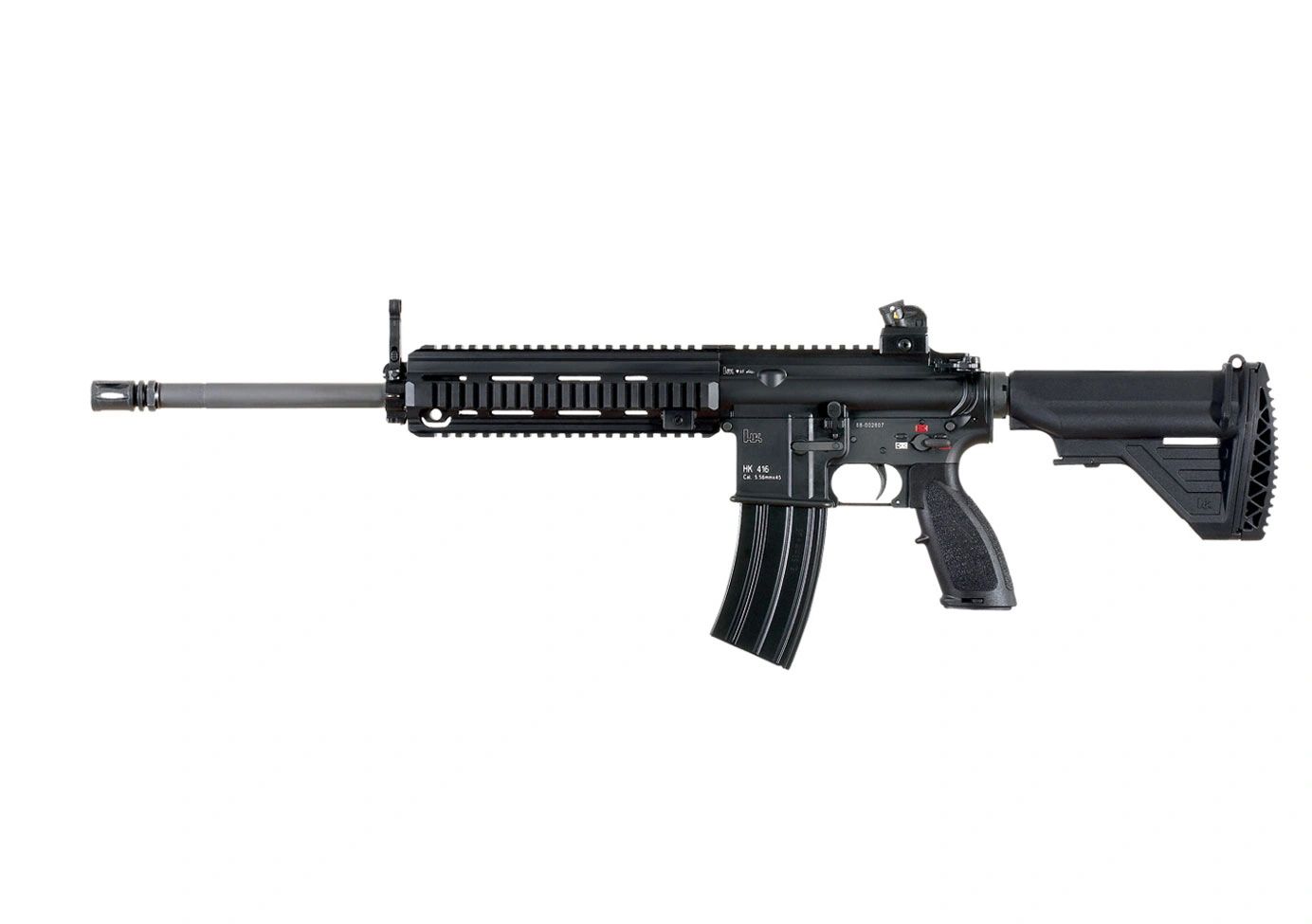 HK416 D with gas block mounted folding front sight, E1 stock and V3 grip