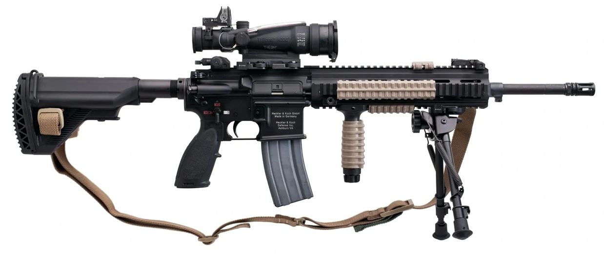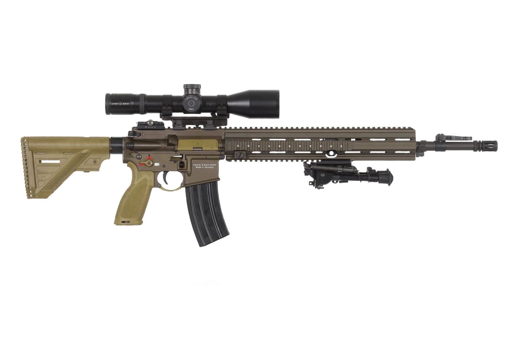 HK416 A5 with 20" barrel configured as a medium range sniper system with a scope and bipod.