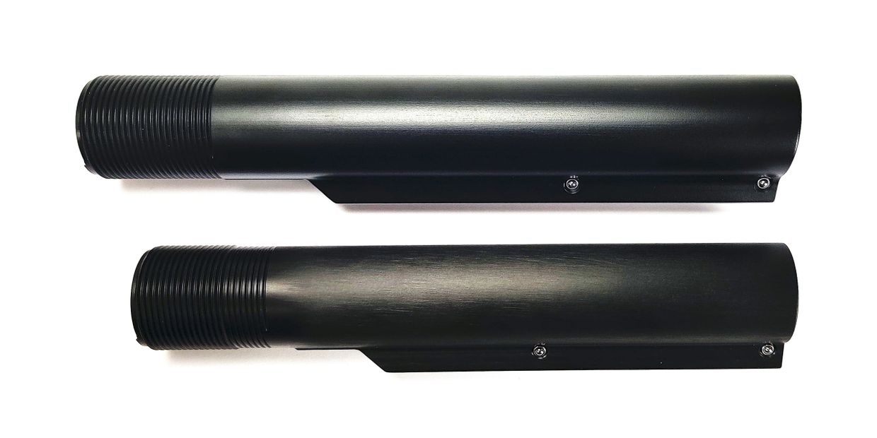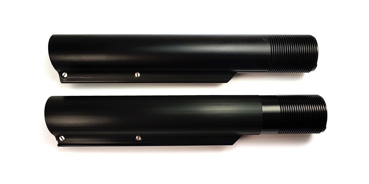 The receiver extension on top is an HK416 A1 HK spec tube and the one on the bottom is an MR556 mil-spec. As you can see here, the commercial spec extension is longer than the mil-spec extension.
